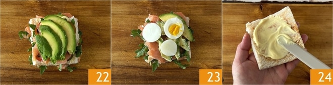 Finalmente, abacate 22, pimenta e ovos cozidos 23. Espalhe maionese em outra fatia de pão 24.