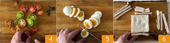 Lave e fatie também os tomatinhos 4. Descasque os ovos que já devem estar mornos e corte-os em fatias 5. Agora derreta a manteiga em outra panela e remova a crosta das fatias de pão de forma 3.