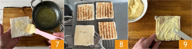 Pincele as fatias de pão com a manteiga derretida 7, depois toste-as brevemente em uma grelha de ambos os lados 8. Você está pronto para montar o primeiro club sandwich: primeiro, espalhe a maionese em uma fatia de pão 9.