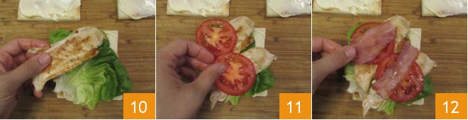 Adicione algumas fatias de peito de peru 10, algumas fatias de tomate 11 e uma fatia de bacon dividida ao meio 12.