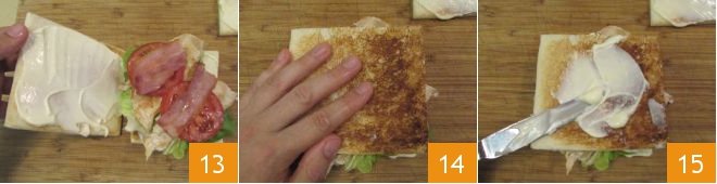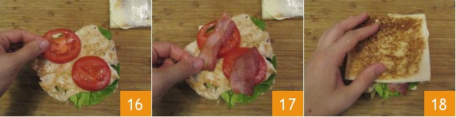 Repita acrescentando a folha de alface, as fatias de carne, os tomates 16 e o bacon 17. Coloque a última fatia de pão sempre com a maionese em contato com os ingredientes 18. Proceda da mesma forma para preparar o segundo Sanduíche Club.