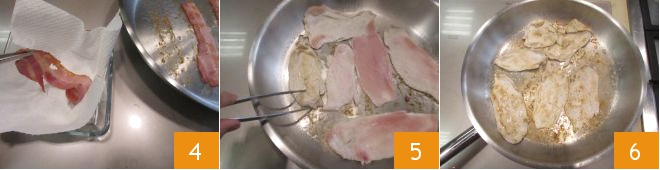 Depois de cozidas e bem douradas, deixe-as esfriar escorrendo sobre papel-toalha 4. Na mesma frigideira você pode cozinhar as fatias de peito de peru por 2-3 minutos no total, virando de ambos os lados 5. Depois de prontas 6, deixe-as amornar.