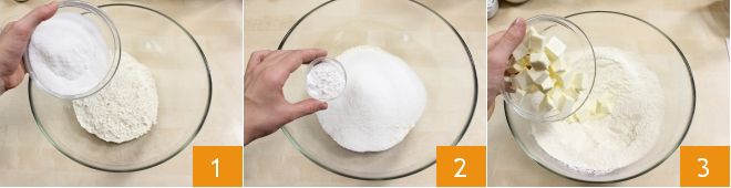 Para preparar o cobbler de frutas vermelhas, misture a farinha 00, o açúcar e o fermento em uma tigela, mexendo com um batedor (1-2). Adicione 120 g de manteiga amolecida em pedaços 3