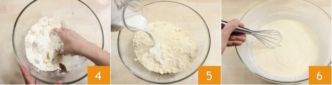 e comece a trabalhar a massa com as mãos 4, até obter uma consistência arenosa (se desejar, você pode fazer essa operação usando um mixer). Neste ponto, adicione o leite aos poucos 5 e misture energicamente com um batedor para obter uma massa lisa, sem grumos 6, depois aromatize com as raspas de limão.