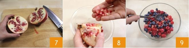 Limpe agora a romã, corte-a ao meio 7 e remova cuidadosamente as sementes 8, depois adicione os grãos suculentos às frutas vermelhas, em uma tigela, misturando tudo 9.