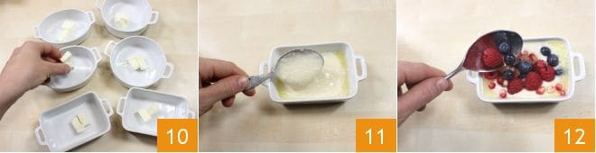 Corte a manteiga restante em pedaços (80 g), coloque-a nas cocottes e derreta-a no micro-ondas 10 (se não tiver, você pode derreter a manteiga em uma panela, em fogo baixo, e despejá-la posteriormente nas formas). Agora, coloque cerca de 70 g de massa no fundo de cada cocotte 11, adicione 50 g de frutas vermelhas 12