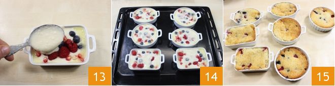 e cubra novamente com uma colher de massa 13, até cobrir todas as frutas. Coloque as cocottes em uma assadeira e leve tudo ao forno pré-aquecido 14, a 180° por 45 minutos, ou até que a superfície esteja dourada 15. Quando estiver pronto, sirva o cobbler de frutas vermelhas morno.