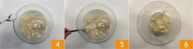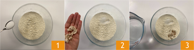 Para preparar os coccoli, coloque a farinha em uma tigela, adicione o açúcar 1, o fermento esfarelado 2 e a água 3.