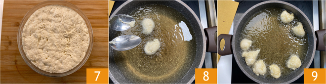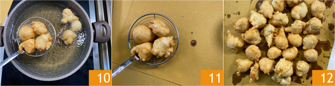 Recupere a massa fermentada 7. Aqueça o óleo vegetal e leve-o a uma temperatura de 170°. Com a ajuda de duas colheres, previamente umedecidas no óleo, deslize os coccoli no óleo 8 e cozinhe 9 até dourar, isso levará cerca de 5 minutos.