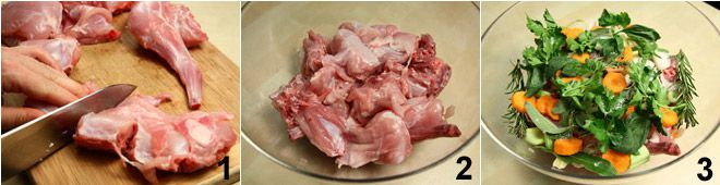 Remova a cabeça, a gordura e os órgãos internos do coelho, depois corte-o em pedaços 1, lave-o e seque-o com papel toalha. Coloque os pedaços de coelho em uma tigela grande 2 e adicione uma cebola descascada e cortada em pedaços grandes, uma cenoura descascada e cortada em rodelas, o talo de salsão em pedaços, o alho descascado e esmagado, o alecrim, o tomilho, os cravos-da-índia, a canela, os grãos de pimenta, as folhas de sálvia, manjericão, louro e salsa 3.