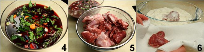 Cubra tudo com o vinho tinto 4, adicione uma pitada de sal e sele a tigela com filme plástico (ou tampe) e coloque para marinar na geladeira por no mínimo 12 até no máximo 24 horas. Após o tempo de marinação, escorra o coelho 5, seque-o com papel toalha e enfarinhe os diversos pedaços 6.