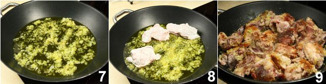 Em uma panelinha, coloque o óleo e a cebola restante picada finamente para murchar em fogo baixo por 10-15 minutos 7; transfira a cebola para uma panela grande (que possa conter o coelho e posteriormente também os legumes da marinada e o líquido) adicione os pedaços de coelho enfarinhados 8 e doure-os de ambos os lados 9.