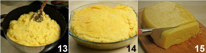 Coloque novamente a panela no fogo (baixo) e mexa com uma colher de pau até que a polenta esteja cozida 13, depois despeje-a em um recipiente 14 (de preferência retangular) que você já tenha pincelado com óleo. Deixe a polenta esfriar bem e depois vire-a sobre uma superfície e corte-a em fatias de cerca de 1 cm de espessura 15 que, se desejar, você também pode grelhar em uma grelha.