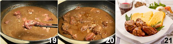 adicione os pedaços de coelho 19, deixe cozinhar por 5 minutos todos juntos 20 e depois desligue. Sirva imediatamente o coelho ao molho salmì com as fatias de polenta 21 regando-as com o fundo de cozimento obtido.