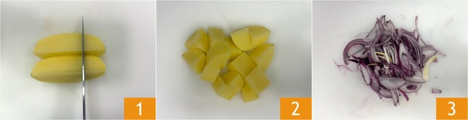 Para preparar o coelho no micro-ondas, primeiro descasque as batatas, corte-as em quartos 1 e depois em pedaços 2. Corte a cebola em julienne 3 e reserve.