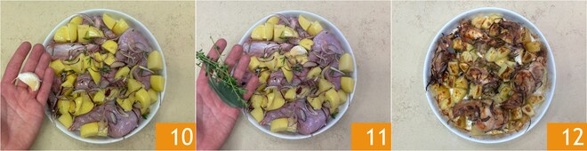 Transfira tudo para uma assadeira levemente untada, adicione o alho 10, o tomilho e a sálvia 11. Cozinhe no micro-ondas a 800 W por 40 minutos. Depois continue o cozimento por mais 10 minutos no modo grill. O coelho no micro-ondas está pronto para ser servido 12.