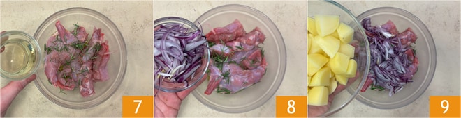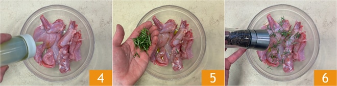 Em uma tigela, coloque o coelho em pedaços, adicione o azeite 4, o alecrim 5, ajuste o sal e a pimenta 6.