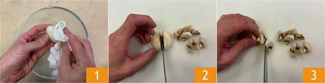 Para preparar os cogumelos champignon na frigideira, primeiramente corte a parte final dos talos, geralmente muito suja de terra, depois limpe os chapéus dos cogumelos com um pano úmido 1. Corte-os primeiro ao meio 2 e depois em fatias 3. Reserve.