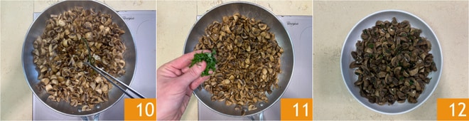 Elimine também os talos de salsinha 10, adicione a salsinha fresca picada 11 e sirva. Seus cogumelos champignon na frigideira estão prontos para serem servidos 12.