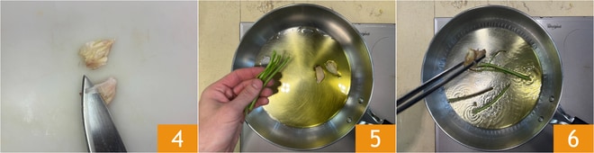 Amasse os dentes de alho com casca 4 e deixe dourar em uma frigideira com um fio de azeite e os talos de salsinha 5. Elimine o alho 6.