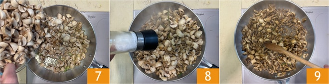 Adicione os cogumelos 7 e deixe-os dourar em fogo alto. Tempere com sal 8 e pimenta. Abaixe o fogo e cozinhe por 10 minutos, mexendo de vez em quando 9.