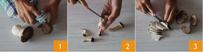 Para preparar os cogumelos gratinados no forno, comece limpando os cogumelos: corte a base do talo mais suja, depois remova o excesso de terra esfregando delicadamente com um pano úmido tanto os pleurotus 1 quanto os chiodini. Se necessário, raspe-os com uma faca de lâmina lisa 2. Se houver muita terra, você pode passar rapidamente os cogumelos em água fria, mas é preferível não fazê-lo para evitar que os cogumelos absorvam água. Corte os chapéus dos pleurotus e fatie-os 3 em fatias de aproximadamente 3 milímetros de espessura.