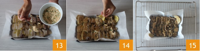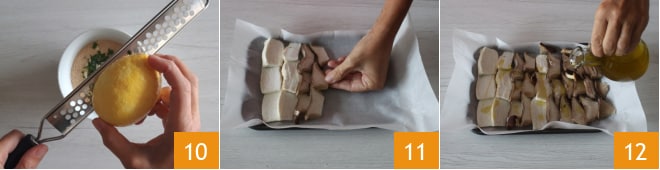 e a casca ralada de meio limão 10. Finalmente, adicione o sal e misture para combinar os ingredientes. Disponha as fatias de cogumelo em uma assadeira forrada com papel manteiga 11, levemente sobrepostas umas sobre as outras. Tempere com 15 gramas de azeite de oliva extra virgem 12.