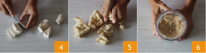 Fatie da mesma forma também os talos 4. Deixe os chiodini inteiros. Esfarele com as mãos o pão duro 5. Bata no liquidificador 6 e coloque em uma tigela.
