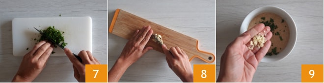 Pique a salsa fresca 7 e o alho 8. Tempere o pão com a salsa, o alho 9
