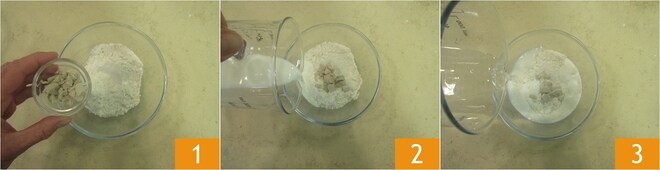 Para preparar a colomba de Páscoa, comece colocando em uma tigela a farinha, o fermento fresco esfarelado 1, o leite 2 e a água 3 em temperatura ambiente.
