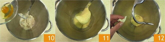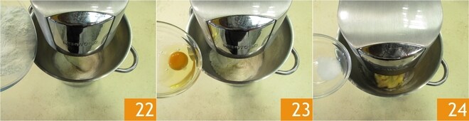 Coloque o gancho, ligue a máquina em velocidade moderada e, quando o açúcar estiver completamente absorvido, adicione a farinha pouco a pouco 22 e deixe incorporar. Em seguida, adicione lentamente também o ovo 23 e, quando estiver bem absorvido, adicione o sal 24.