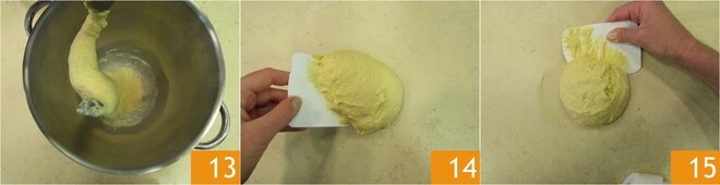 Continue trabalhando a massa até que esteja bem desenvolvida 13. Não pare antes porque o desenvolvimento é fundamental. Em seguida, transfira para uma superfície de trabalho 14 e, com a ajuda de uma espátula, trabalhe por alguns instantes, para dar à massa uma forma esférica 15. Não adicione farinha nesta fase.