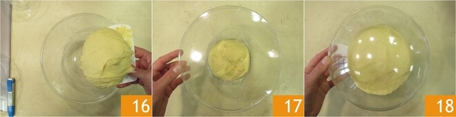 Transfira para uma tigela de vidro 16, cobrindo com filme plástico 17. Deixe fermentar novamente, a uma temperatura de 25-27° por 2 horas - 2 horas e meia ou até que dobre novamente de volume 18. Novamente, a mesma regra anterior se aplica: se a temperatura em casa for mais baixa, você pode prolongar o tempo de fermentação ou colocar a massa no forno desligado apenas com a luz acesa. Ou você pode colocar no fundo do forno desligado uma tigela com água quente para criar a umidade e calor adequados na câmara de fermentação. O importante é que a massa dobre.