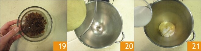 Uma vez que tenha crescido, lave as passas e deixe de molho em água por pelo menos dez minutos 19. Enquanto isso, coloque a massa na tigela da batedeira 20 e adicione o açúcar 21.