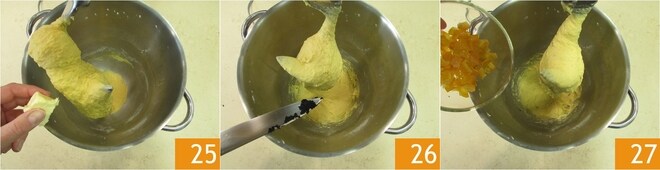 Espere ainda alguns instantes até que seja absorvido, então adicione a manteiga amolecida pouco a pouco, esperando que o pedaço seja absorvido antes de adicionar outro 25. Neste caso também é necessário paciência. Quando a manteiga estiver absorvida, prossiga com os aromas: as sementes de uma fava de baunilha 26, as cascas de laranja cristalizadas cortadas em cubos 27.