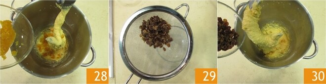 Adicione também a pasta de laranja 28. Neste ponto, escorra bem as passas 29 e incorpore-as à massa 30.