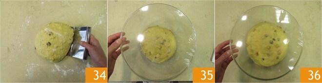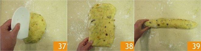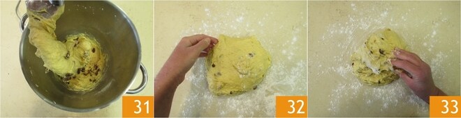 Trabalhe a massa até que esteja bem desenvolvida, tendo incorporado as frutas cristalizadas e as passas, no total levará cerca de 20 minutos 31 Esta fase também é importante: não pare a batedeira até que esteja bem desenvolvida. Transfira a massa para uma superfície ligeiramente enfarinhada 32, achate-a delicadamente com as mãos e faça dobras de reforço, trazendo as bordas externas da massa para o centro 33.