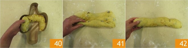 Coloque o rolo dentro da forma, dobrando as extremidades até preencher a forma das asas 40. Em seguida, pegue a porção de massa de 470 g, estenda sobre a superfície e enrole 41 de modo a formar um segundo rolo 41.