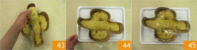 Coloque-o sobre o outro rolo, na parte mais longa da forma para formar o corpo da colomba 43. Transfira para uma bandeja 44, cubra com filme plástico apenas colocando-o por cima 45 e deixe fermentar por cerca de 3 horas em temperatura ambiente (longe de correntes de ar), ou até que atinja quase o bordo da forma. Considere que pode levar mais tempo nesta fase e é uma fase importante: até que atinja o bordo como indicado, não recomendamos assar.