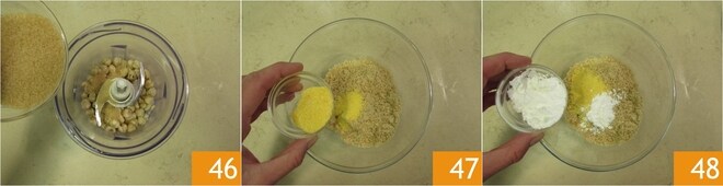 Quando a colomba estiver fermentada, você pode cuidar da cobertura: coloque em um mixer as amêndoas e as avelãs descascadas, adicione o açúcar mascavo 48 e triture tudo. Transfira a mistura para uma tigela, adicione a farinha fioretto 47, o amido de milho 48,