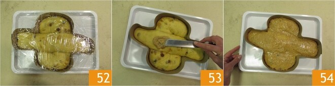 Em seguida, recupere a colomba já fermentada 52, retire o filme plástico e cubra com a cobertura recém-preparada, espalhando delicadamente para cobrir toda a superfície, sem exercer muita pressão 53 54.