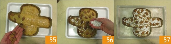 Decore com as amêndoas 55 e com o granulado de açúcar 56. Transfira a forma para uma assadeira 37 e asse a colomba em forno estático pré-aquecido a 170° por 55 minutos na prateleira central. Para evitar que fique muito dourada superficialmente durante o cozimento, coloque uma assadeira acima da colomba, atenuando assim o calor proveniente da resistência.