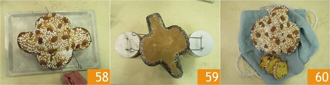 Uma vez retirada do forno, insira espetos longos de aço ao longo de toda a extensão da colomba 58 e posicione-a de cabeça para baixo, suspensa em suportes, para deixá-la esfriar. Isso fará com que a colomba, ao esfriar, não colapse no centro. Uma vez fria, retire os espetos de aço e sirva sua colomba de Páscoa 60!