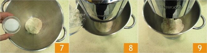 Uma vez que a massa tenha fermentado, transfira para a tigela de uma batedeira equipada com gancho e adicione o açúcar 1. Ligue a máquina e incorpore a farinha pouco a pouco 8. Continue trabalhando para que seja completamente absorvida.