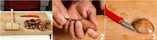 Para limpar e usar os fasolari, você precisará de uma faca com ponta arredondada e lâmina fina e um martelo de cozinha para bater carne. Existem dois tipos de fasolari: um com a concha mais clara e outro com a concha mais escura: o sabor e a consistência da carne, no entanto, são os mesmos 1. Para limpar corretamente os fasolari, é necessário abri-los cortando os dois músculos laterais internos. Segure-os com cuidado, colocando a parte mais curta da concha virada para baixo na palma da mão 2. Insira a lâmina entre as duas válvulas ajudando-se com a pressão do dedo. Insira a ponta plana da faca até o fundo 3 e