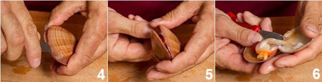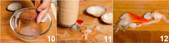Se você quiser usá-lo cozido, após coletar em uma tigela o líquido do molusco 10, extraia o fruto da concha e coloque-o em uma tábua de corte. Com a ajuda de um martelo de cozinha como este, amacie a carne do fasolari, insistindo no pé vermelho, até que fique fina, íntegra e macia (11-12).