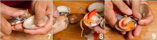 Agora, proceda eliminando a pele acinzentada que cobre o fruto e o saco intestinal que contém pedrinhas que, se deixadas dentro, darão a sensação de areia no produto (7-8). Separe o fasolari também da parte inferior da concha 9. Se você quiser consumi-lo cru, o fasolari está pronto e, cuidando para reter o seu líquido dentro da concha, você pode temperá-lo com um pouco de pimenta ou suco de limão.