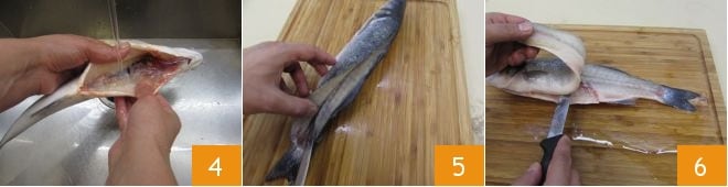 Para limpar e filetar o robalo, comece a escamá-lo: coloque-o na pia e deixe a água corrente fluir enquanto você procede com a ferramenta apropriada 1 ou com a lâmina de uma faca. Colocando-o na pia para esta operação, você evitará a dispersão das escamas. Esfregue a ferramenta de escamação começando pela cauda do peixe até a cabeça. Repita esta operação várias vezes até que o robalo esteja totalmente sem escamas. Transfira o robalo para uma tábua de corte para eviscerá-lo: com a ajuda de uma tesoura, faça uma incisão a partir da parte final do ventre e seguindo toda a barriga até a cabeça 2. Remova as vísceras internas 3.