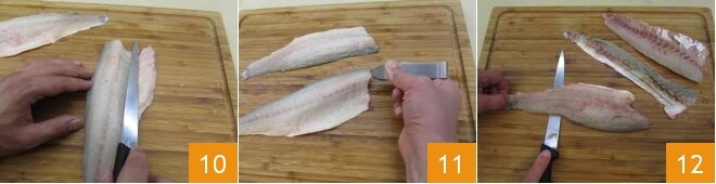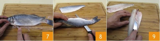 Agora prossiga separando o filé do animal com um corte preciso na altura das brânquias 7: incline levemente a faca na diagonal para fazer um bom corte. Em seguida, prossiga no outro lado do peixe, obtendo o segundo filé: passe a lâmina da faca da cauda até as brânquias 8, realizando então um corte na altura das brânquias para destacá-lo da espinha. Elimine agora as barbatanas dorsais. Agora você terá obtido os dois filés. Neste ponto, você pode cortar a cabeça do robalo inclinando a lâmina da faca diagonalmente na altura das brânquias. Com uma faca, levante as espinhas laterais no ventre do peixe 9.