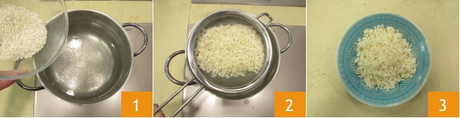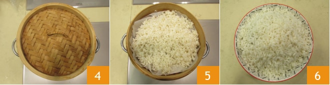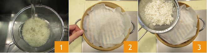 Para preparar o arroz no vapor, comece colocando uma panela com água no fogo e leve a ebulição. Enquanto isso, enxágue o arroz 1 e escorra. Coloque uma folha de papel manteiga na panela de vapor 2 e coloque sobre a panela. Depois, transfira o arroz 3 e distribua por toda a superfície.